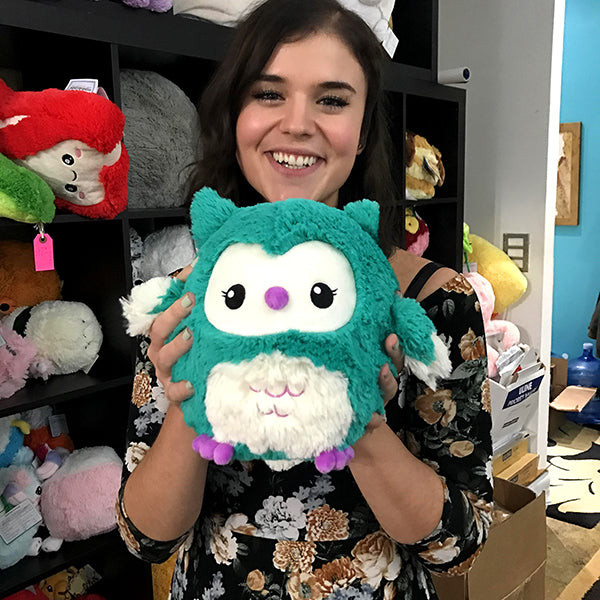 Imagine my delight when today I discovered that my little Hibou has subtly sparkly feathers! I hadn't noticed them since he arrived a couple of weeks ago, but when the afternoon sunlight caught his teal fluff, the tips glistened as if he were still covered in dew. I did not know this was a feature! Maybe he is a very special baby owl indeed! Or maybe he has been playing with his friend the Mini Snow Wolf, and they exchanged some sparkles. (He is not afraid of the Snow Wolf because he is bigger. I have learned such charming incongruities are essential to the marvelous world of Squish.) He is very squishy and snuggly, and his tiny purple beak and toes are super sweet. The unexpected sparkles just add to his adorableness.